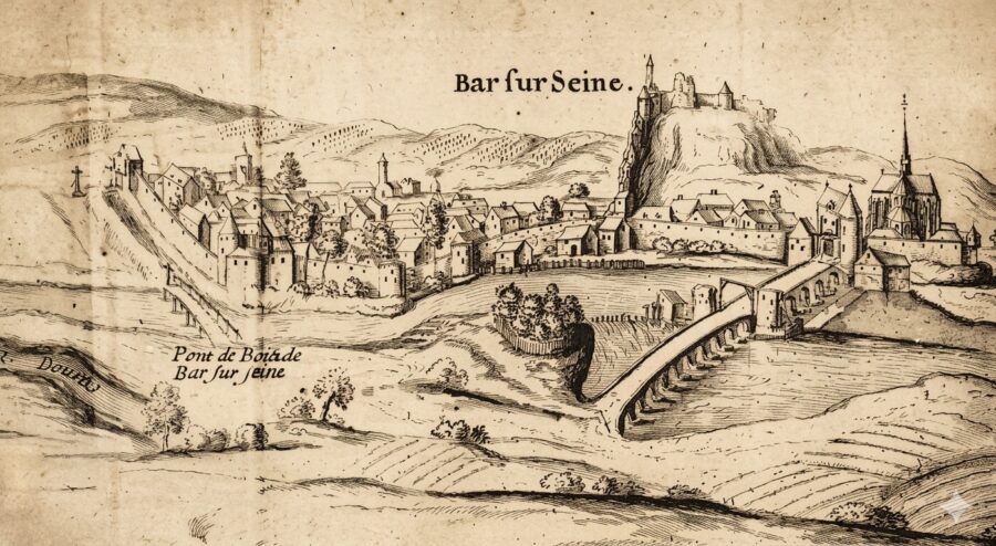 D’après une gravure de l’époque, représentant Bar-Sur-Seine, ville fortifiée et surmontée par le château qui a vue naître Jeanne de Navarre, comtesse de Champagne, future Reine de France en devenant l’épouse de Philippe IV Le Bel