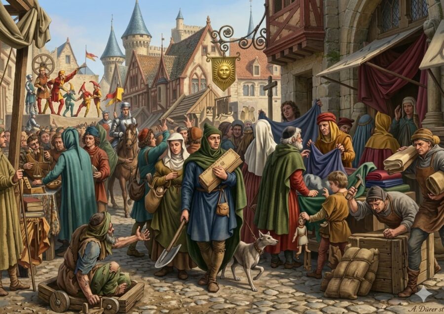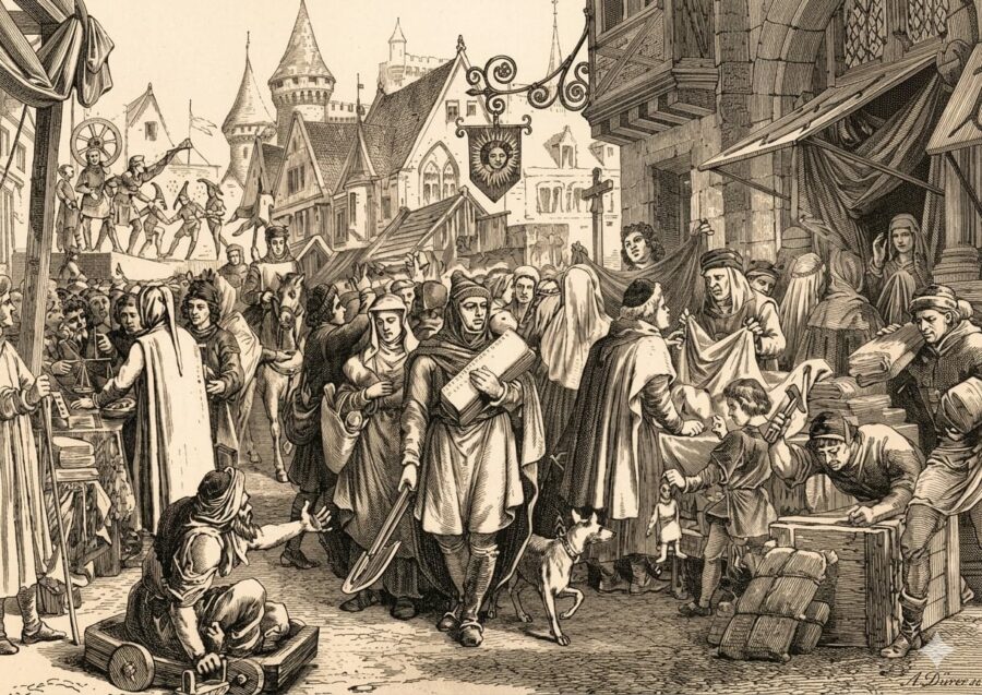 Voici une gravure de faible résolution représentant une scène des Foires de Champagne :